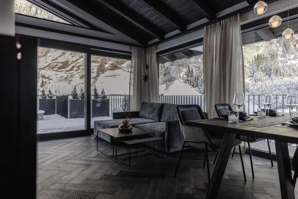 Puristisches Design mit vollem Charakter, ein Platz zum Ruhefinden und ein Ort, um alpinen Luxus auszukosten – so die Anforderungen der Gastgeberfamilie an das neue Domizil. Diese erstrebte Wohlfühlatmosphäre wurde durch den Einsatz jeder Menge Naturmaterialien erzielt. So finden Gäste, wenn sie in den sonderangefertigten Bettkästen liegen, jede Menge Holzmaserungen, die sie mit den Augen nachzeichnen können.